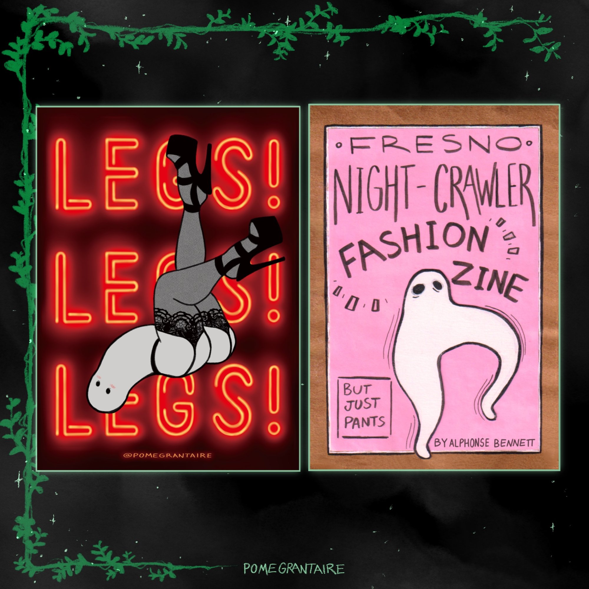 12 page, full colour zine depicting the Fresno Night Crawlers of all shapes and sizes, sporting a range of fashionable pants. Custom thank you nightcrawlers drawn on the last page. Just silly little guys in pants.